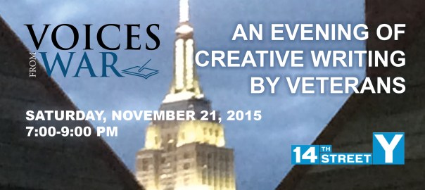 Last month, Voices From War celebrated “An Evening of Creative Writing by Veterans,” a fabulous first READING by our participants! On November 21st, we filled the studio as our wonderful host the 14th Street Y welcomed recent Voices From War students in sharing their original writing with a vibrant audience of friends, colleagues, family, and supporters of Voices From War’s participants and our workshops. Twelve readers, spanning decades of military service – from Korea up through Iraq and Afghanistan – shared memoir, poetry, and fiction.