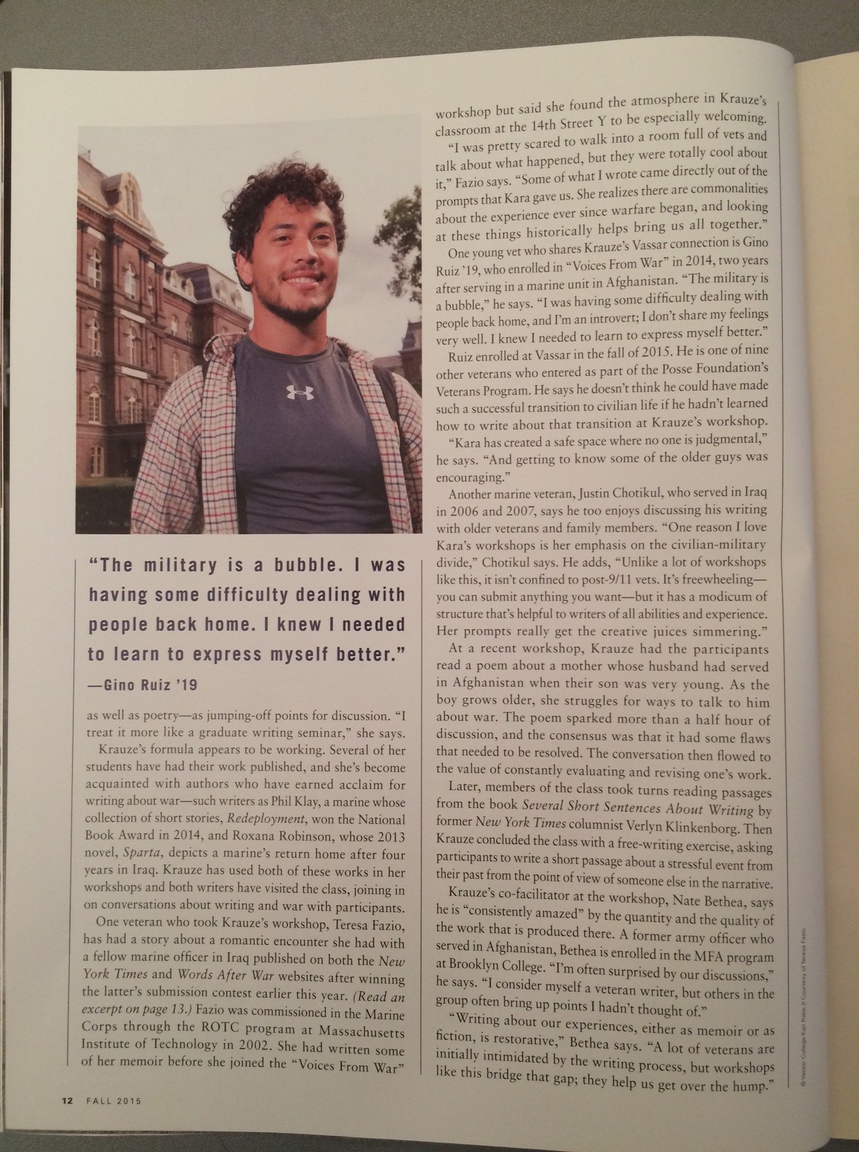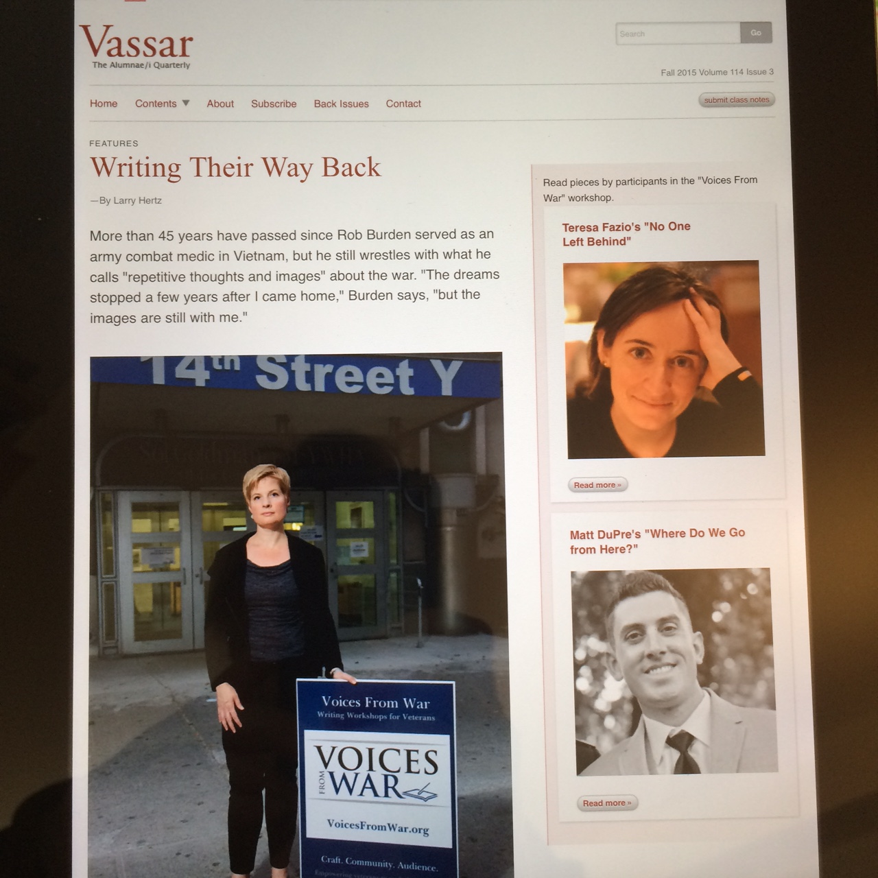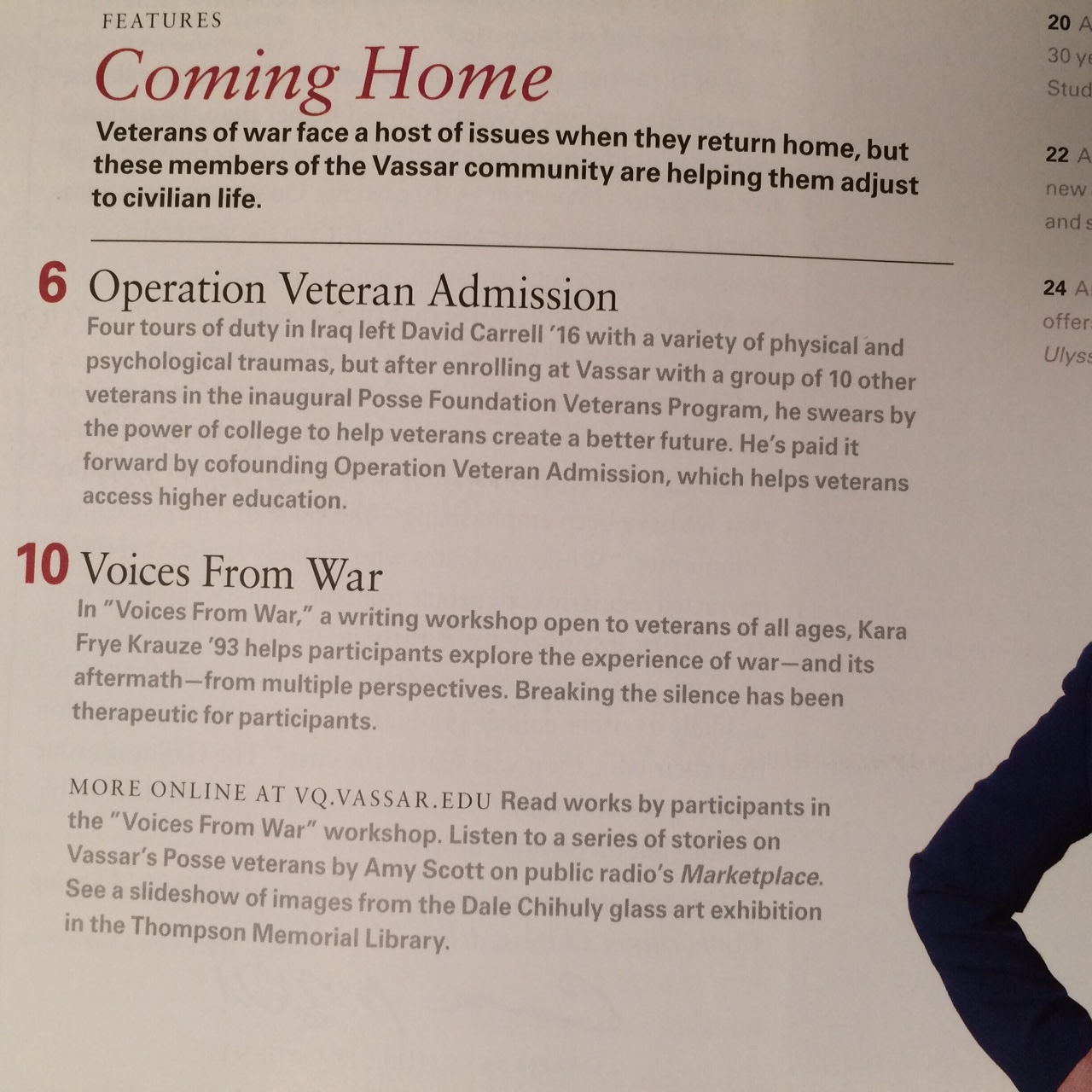 And NEXT, we are proud to share a magazine piece in the new issue of the VASSAR QUARTERLY about Voices From War, and featuring insights from participating veterans along with  writing by two of our participants!