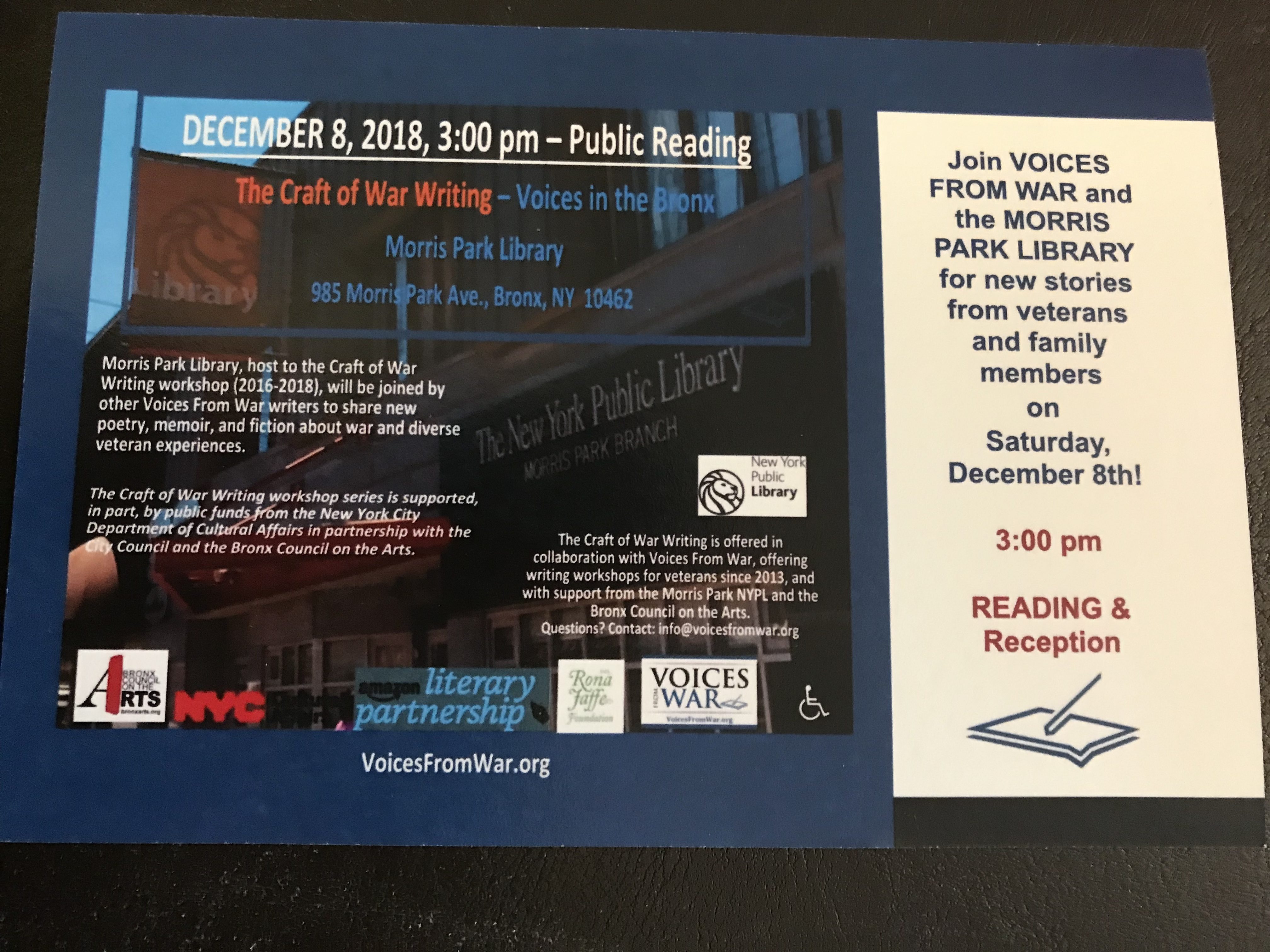 96E50E1D-487B-4332-B019-64336B974314 Published on December 8, 2018 in Don’t Miss – This SATURDAY! – “The Craft of War Writing – Voices in the Bronx”Full resolution (4032 × 3024) ← Previous