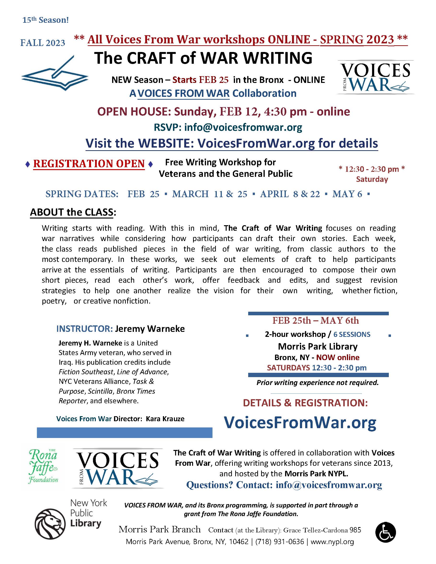 Craft_of_War_Writing_VFW_(Bronx_ONLINE)_SPRING_2023__FLYER Published on February 3, 2023 in HomeFull resolution (1820 × 2354) ← Previous Next →