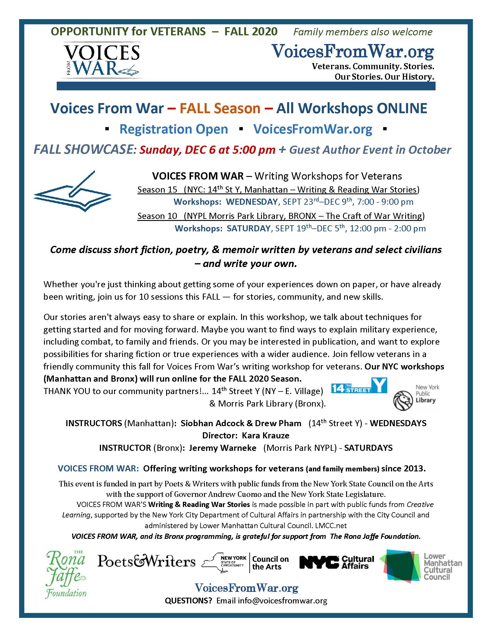 Writing & Reading War Stories in the 21st Century – we’ve entered our sixth year of workshops!  *  Seasons 10 & 11 at our fantastic downtown Manhattan host, the 14th Street Y.  *  Our thanks to Nina Semczuk, a dedicated Teaching Associate and then co-Instructor for several seasons.  *  With Nina’s departure, we were fortunate to be joined by Siobhan Adcock, talented author and also a veteran family member, with her second novel just out in 2018.  *  Thank you to our Manhattan co-instructors Scott Reel and Siobhan Adcock. All INSTRUCTOR BIOs can be found on the website’s Instructors’ page.