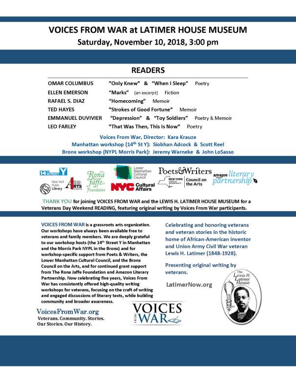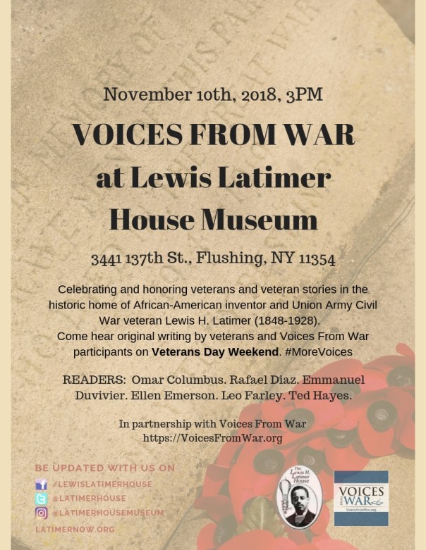 November 10, 2018 – Voices From War at Lewis Latimer House Museum (Reading in Queens)