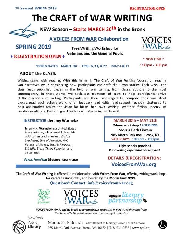 Morris Park Library, host to the Craft of War Writing workshop (2016-2018), will be joined by other Voices From War writers to share new poetry, memoir, and fiction about war and diverse veteran experiences.