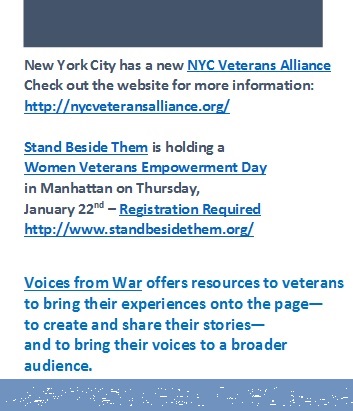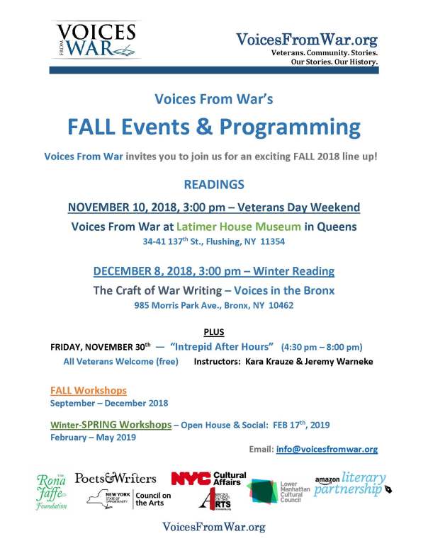We will continue to update you on upcoming events, publication of our first collection of participant work in Voices from War, Volume 1, and other interesting news, writing tips, and thoughts on veterans’ stories and writing.