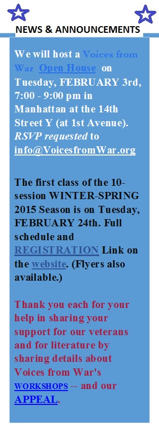 REGISTRATION and Class Details for the Winter-Spring 2015 Voices From War (NYC, Season 4) workshop available on the website.
